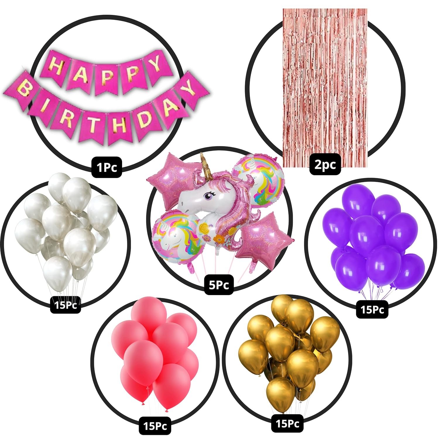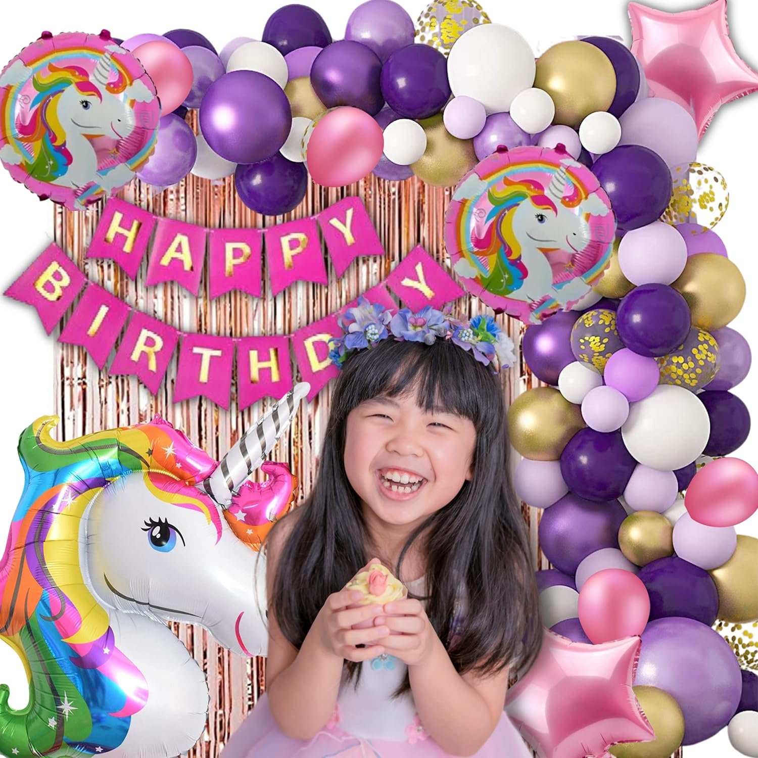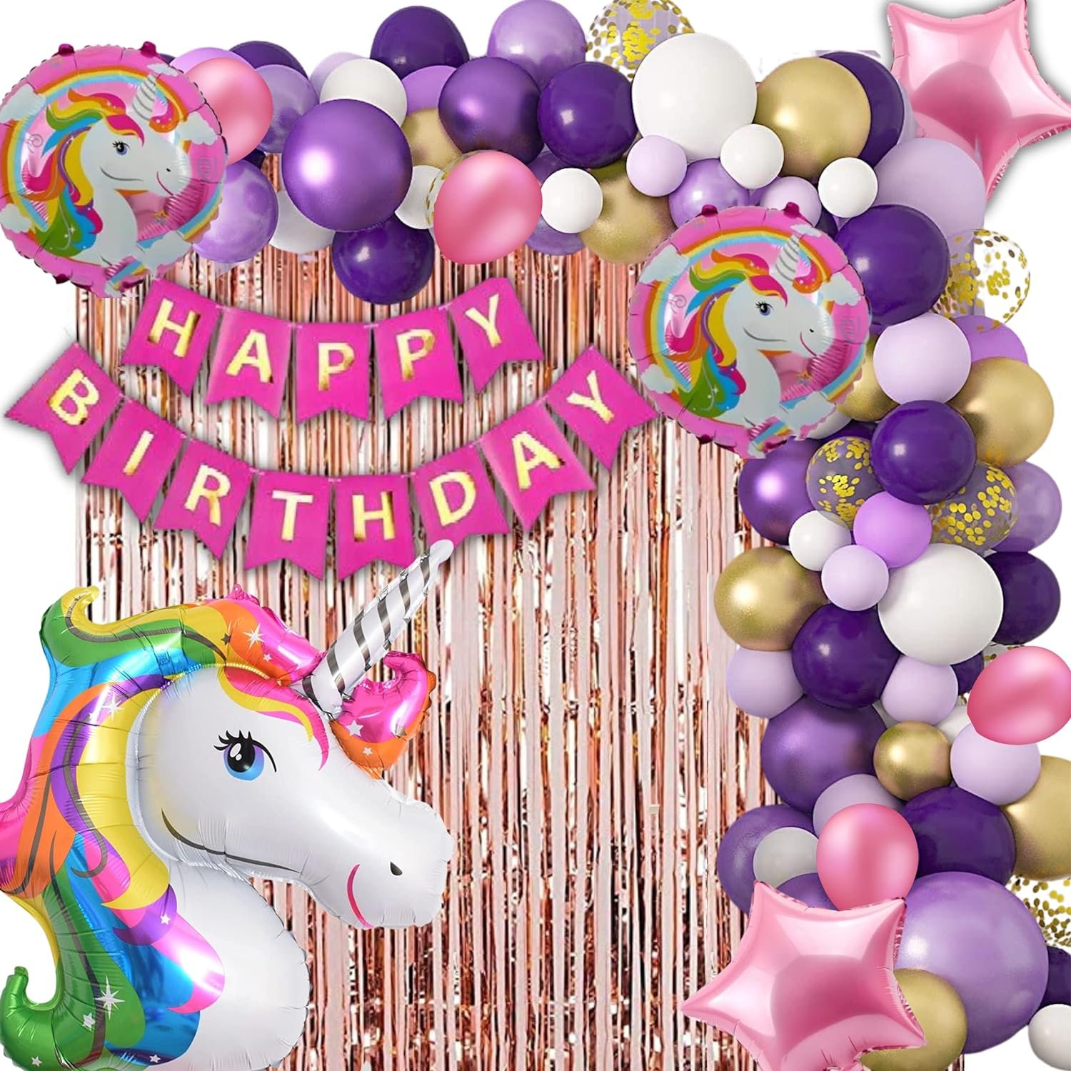 60pc white, pink and purple and golden metallic balloons, Pink Happy Birthday Banner, Unicorn foil balloon set of 5, 2pc Rose Gold foil fringe curtain