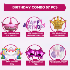 1 Pc happy Birthday foil ( rainbow) + 2 Pcs unicorn foil + 2 Pcs star foil pink foil + 1 Pc crown foil Golden + 1 Pc crown foil pink + 50 Pcs mix balloons ( Purple, white,pink)